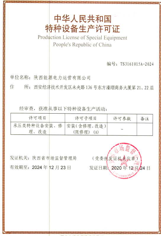12月25日,從陜西省市場監督管理局傳來喜訊,由我公司申請的承壓類特種設備安裝(限修理)(A)資質成功獲批。該資質是目前集團系統電力承壓設備檢修所取得的最高資質,標志著公司全面具備了參與電力檢修市場的資格,必將為企業拓展發展空間、加快市場化改革,打造“能源工匠 品質運營”品牌,提供有力的支撐。